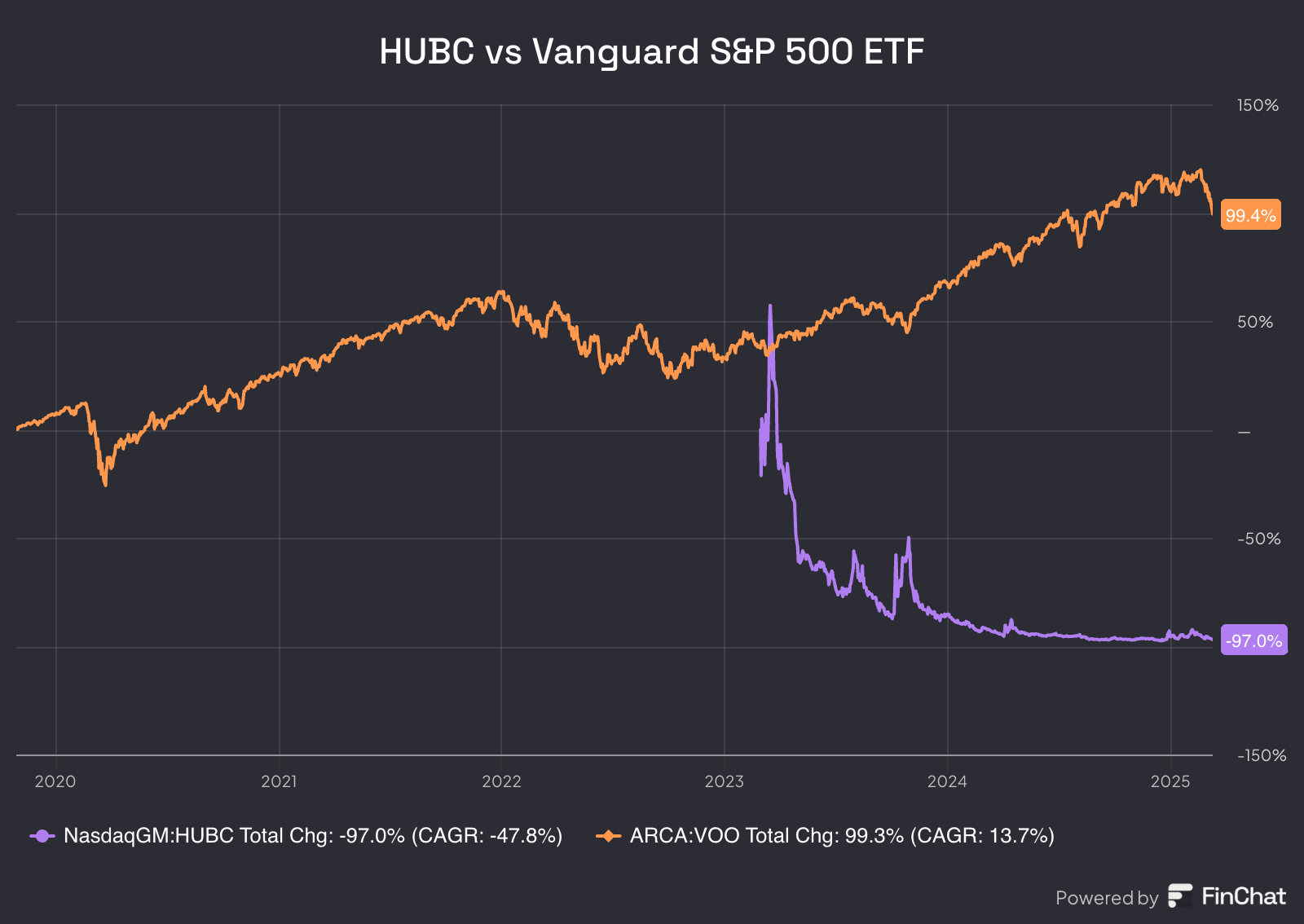 This chart paints a stark contrast between HUB Cyber Security (HUBC) and the Vanguard S&P 500 ETF (VOO). While the S&P 500 has nearly doubled (+99.3%) since 2020, HUBC has collapsed by 97%.