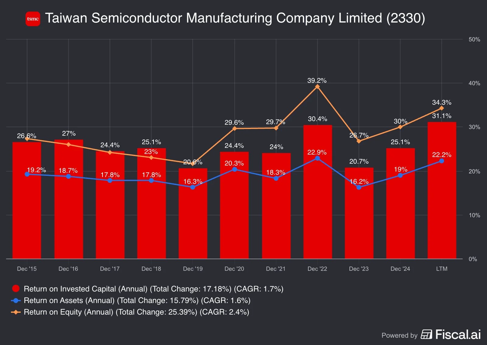 Even while building fabs globally, returns stayed elevated — that’s rare.